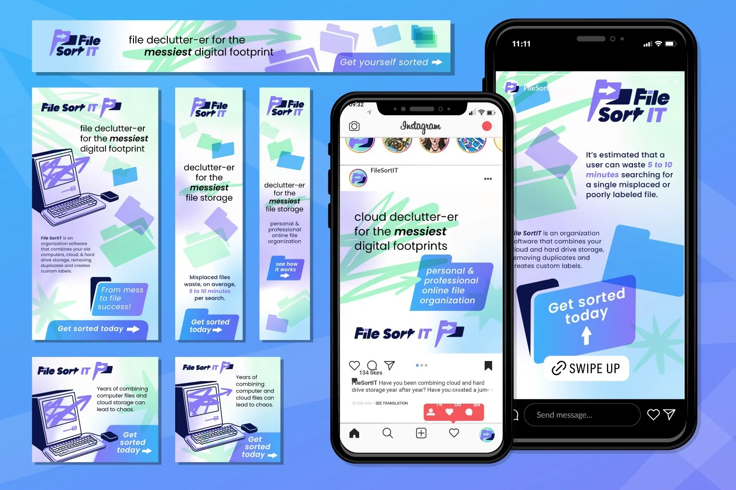 An organizational software designed to simplify file chaos, which serves as the inspiration for the brand elements. The core brand keywords are chaos, simplification, action, success, and excitement. Each touchpoint begins with a sense of disorder and transitions to a streamlined solution—represented visually through scribbles and organic shapes that gradually resolve into clean, flat graphics. The logotype features italics and a flag symbol to represent achievement.
